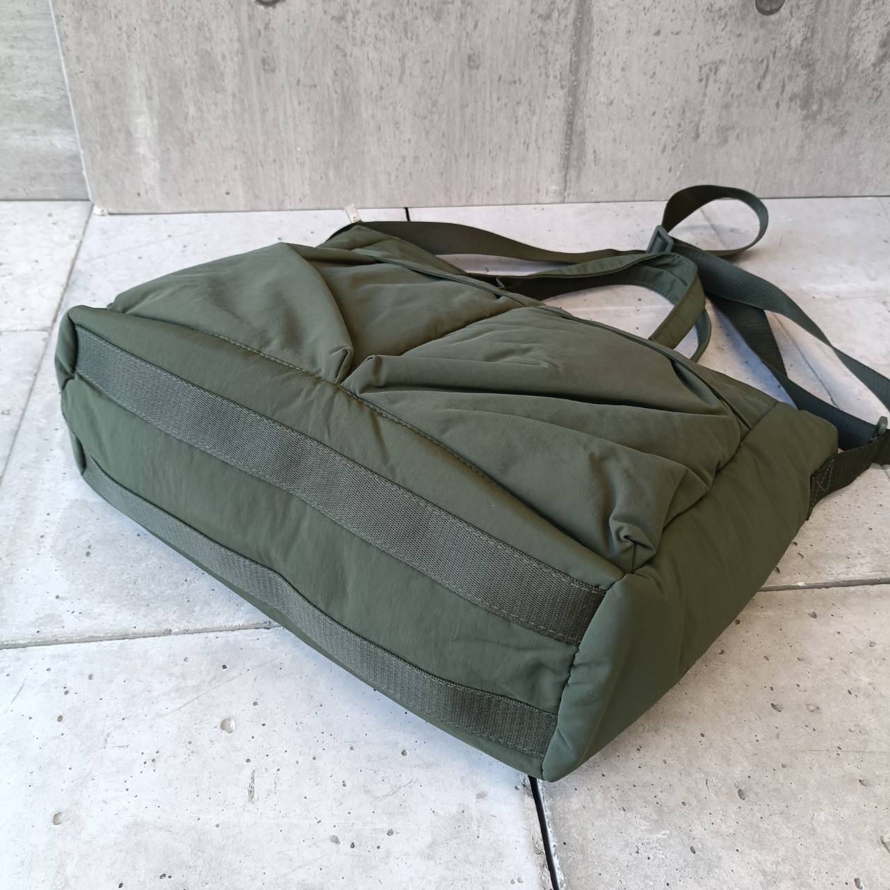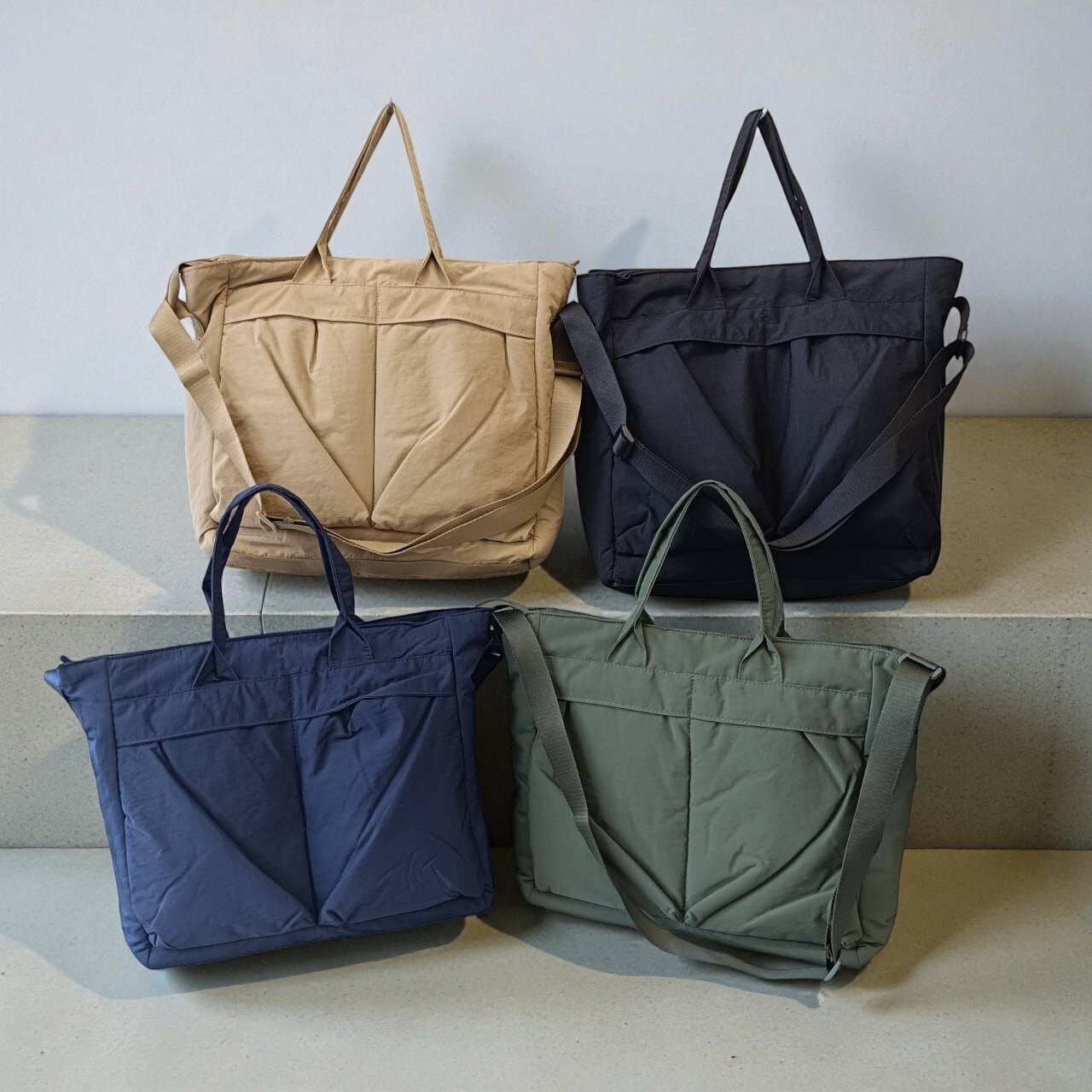 ふんわり中綿のやさしいフォルムが魅力の、軽量ナイロン2WAYトートバッグ。